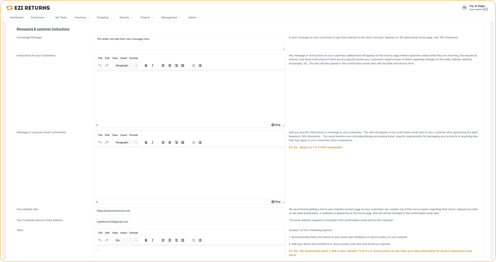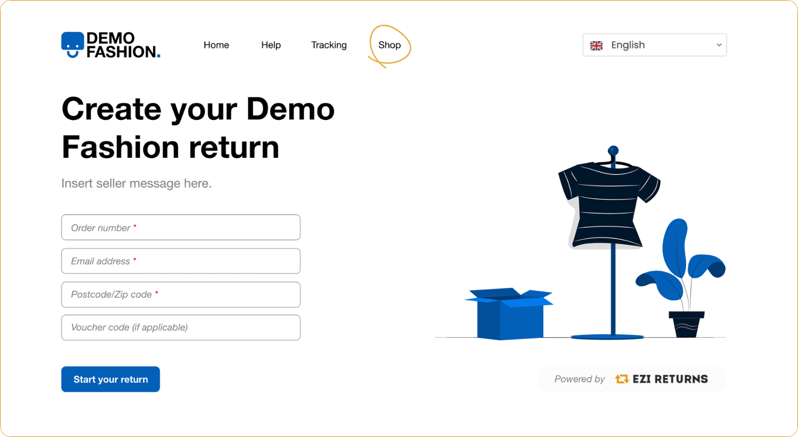 Specify your own discount code and set an optional expiry date, or leave blank if no expiry date is required. You then send this code to any customers requiring a free post return with the following instructions:
