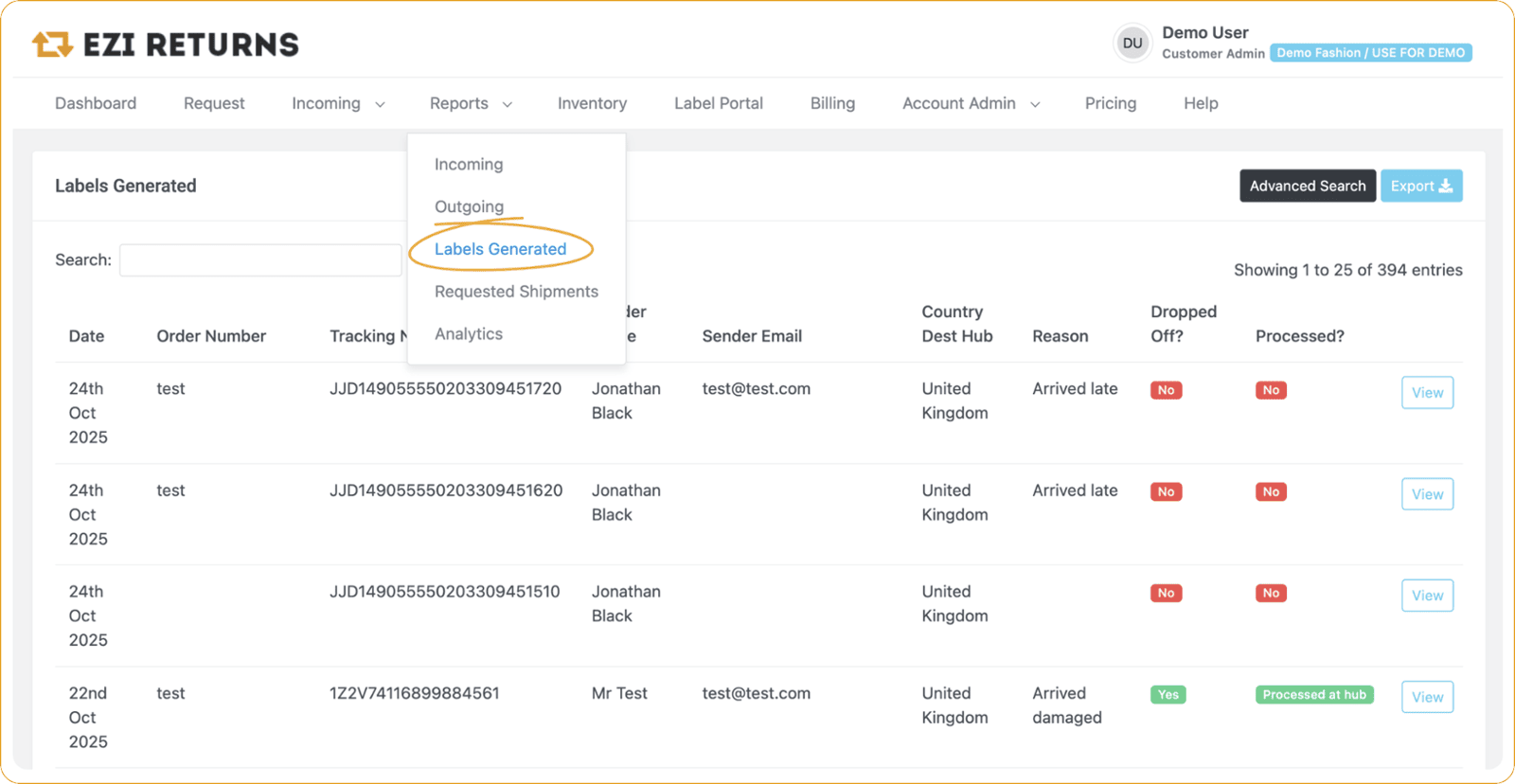 - The Labels Generated report screen will appear. Click Advanced Search to refine your results.