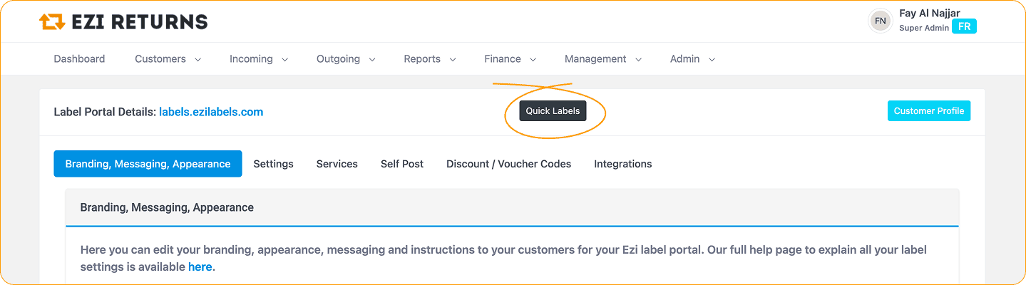 If you are logged into the Ezi Returns management portal, you can access the Quick Label function either using the your label portal URL with yoururl.ezilabels.com/quick added or by selecting the 'Quick Labels' button within your portal settings (no password required if you are already logged in).